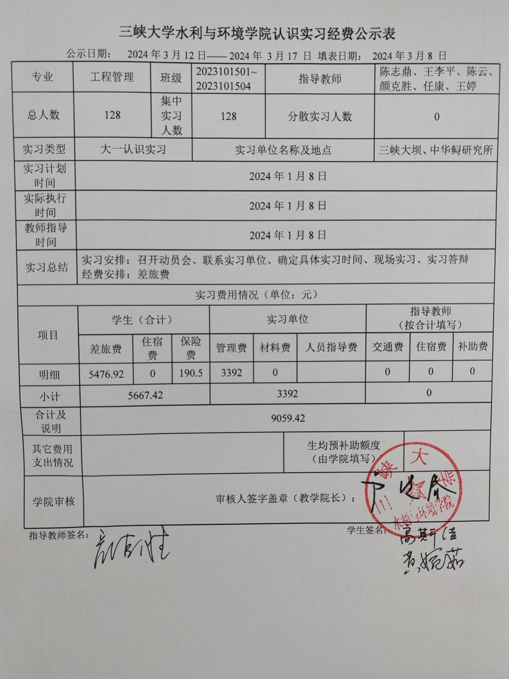 工程管理专业认识实习经费公示表