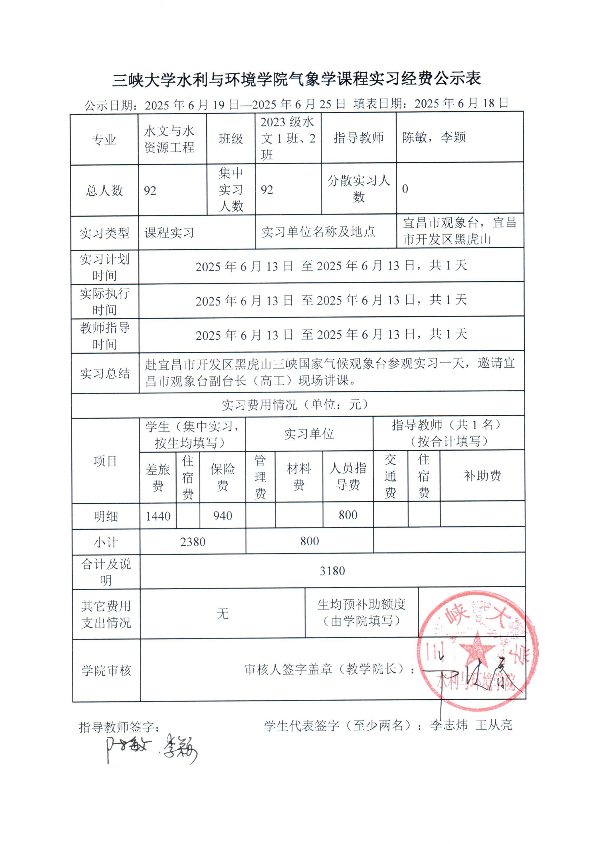 水文与水资源工程气象学课程实习经费公示表
