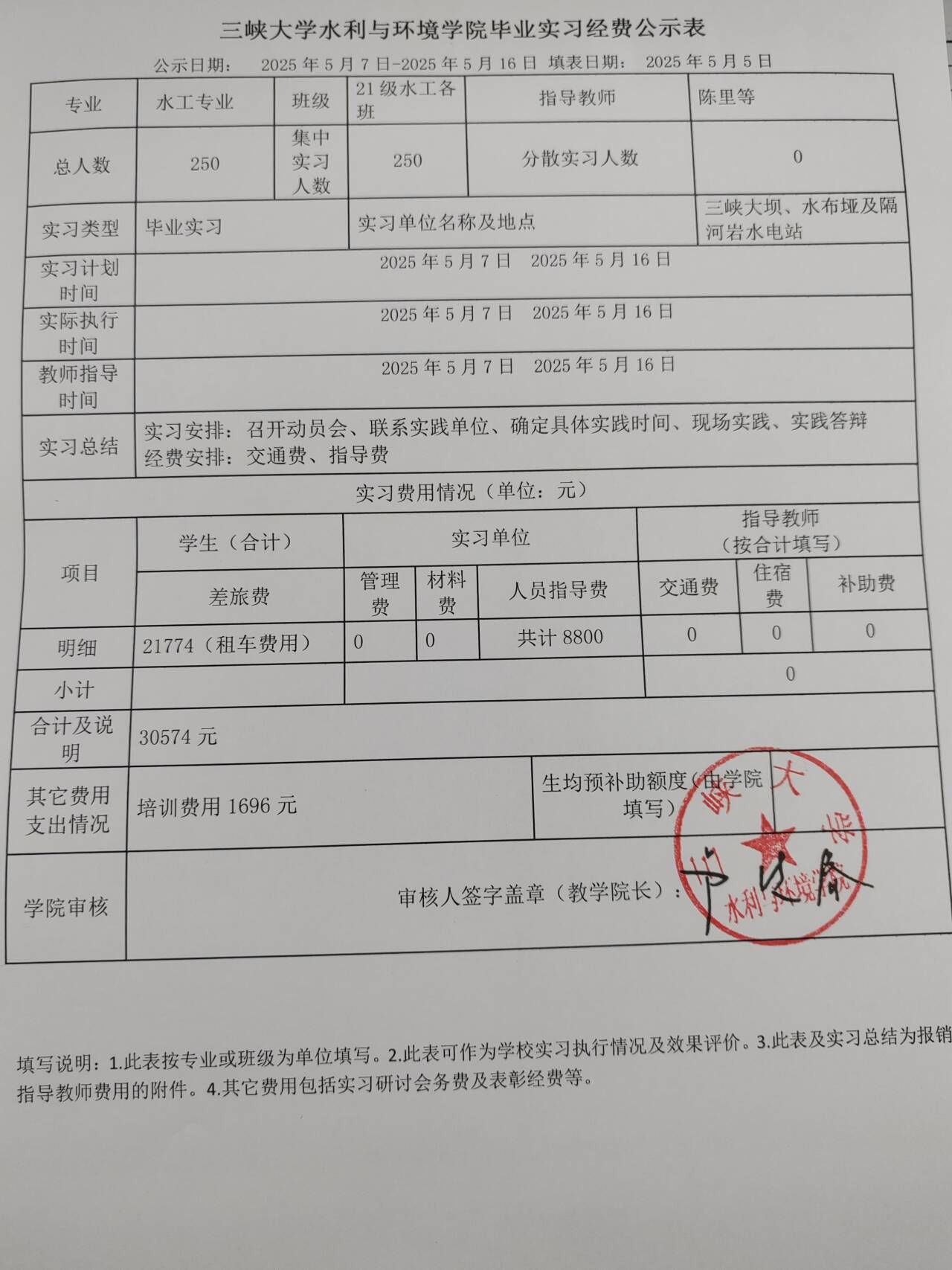 水利水电工程专业毕业实习经费公示表