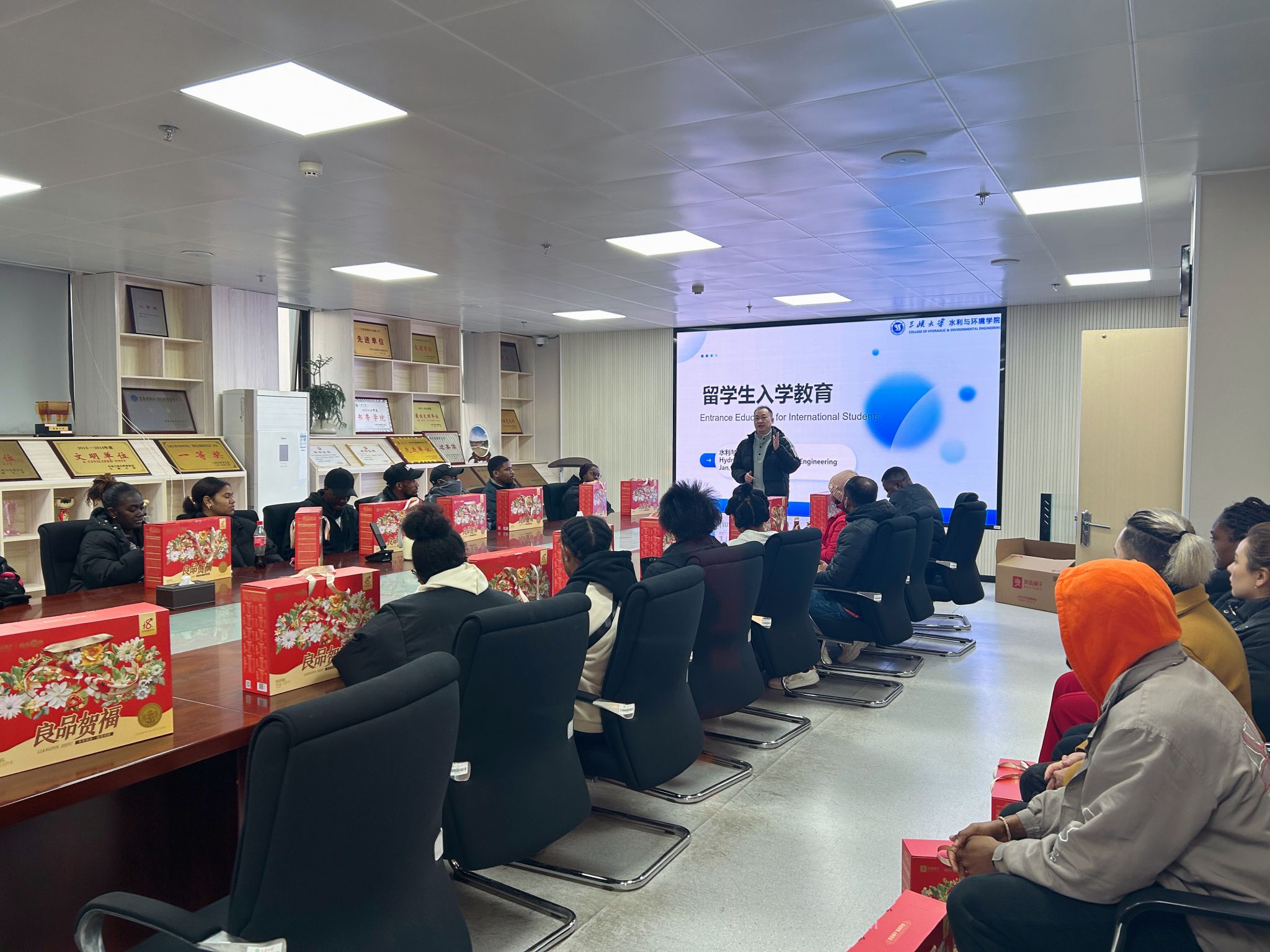 1月9日下午,正值2025年寒假放假前夕,学院副院长石小涛老师和辅导员朱李超老师,组织在校留学生开展假期安全教育暨2024级新生入学教育,并代表学院向留学生发放了“新春大礼包”,送上新春祝福和关怀。