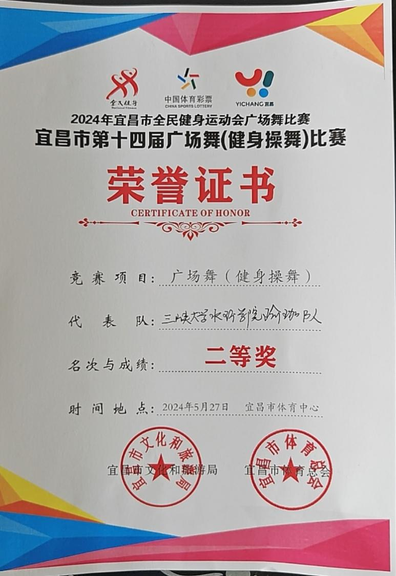 (通讯员 张兰华)近日,在宜昌市文化和旅游局、宜昌市体育总会主办的2024年宜昌市全民健身运动会广场舞比赛暨宜昌市第十四届广场舞(健身操舞)比赛中,水环瑜伽队荣获二等奖。这是水环瑜伽队首次代表学院参加宜昌市级比赛,展示了学院教职工积极向上的精神风貌和团队凝聚力。