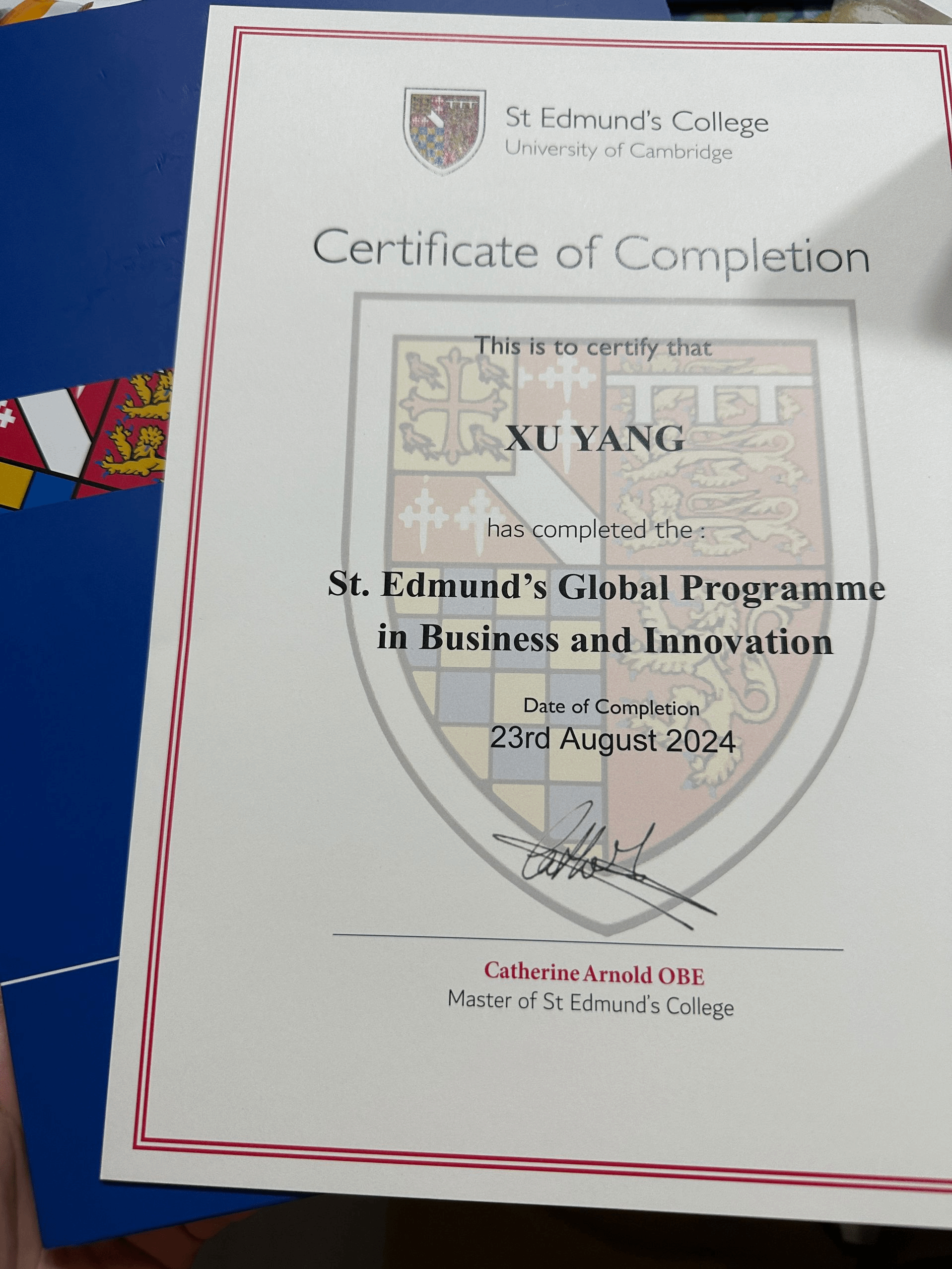 游学的第一周和第二周,我们在剑桥大学内进行了主题为“Business and Innovation”的课程学习。课堂上,教授们用他们深厚的学术底蕴和独特的见解,引领我们探索商业与创新的奥秘。课程通过老师授课与小组合作的形式进行。在小组里,我与来自各个大学的同学们共同研讨,完成创办公司的构想,从市场定位到产品设计,深入研究市场趋势,分析竞争对手,制定营销策略,并不断完善我们的商业计划。最终在课堂上展示了我们的成果。领到项目结业证书的那一刻,我深知这不仅是对我这段时间学习的肯定,更是对我未来学术和职业发展的一种激励。我将带着这份荣誉和经历,继续努力学习,不断提升自己。